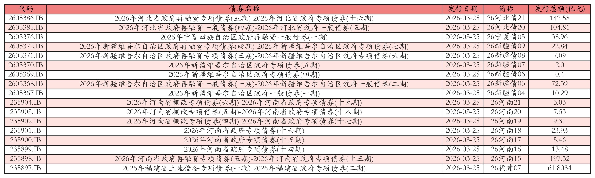 南财智讯3月25日电,盘后数据显示,2026年3月25日全国共发行17只地方政府债,共计723.2234亿元。其中,政府一般专项债发行4只,共226.45亿元;地方政府专项债发行13只,共496.7734亿元。各地方政府所发行债券中,26宁夏债05、26新疆债05、26河北债21、26河南15、26福建07发行规模靠前,发行金额分别为38.96亿元、72.39亿元、142.58亿元、197.32亿元、61.8034亿元。投标方面,各地方政府所发行债券中,26宁夏债05、26新疆债05、26河北债21、26河南15、26福建07全场中标倍数靠前。其中:26宁夏债05全场中标倍数为17.71,全场中标利率为1.75%,边际倍数为1.07;26新疆债05全场中标倍数为17.02,全场中标利率为1.98%,边际倍数为2.18;26河北债21全场中标倍数为21.21,全场中标利率为2.0%,边际倍数为4.53;26河南15全场中标倍数为24.01,全场中标利率为2.52%,边际倍数为1.15;26福建07全场中标倍数为25.55,全场中标利率为1.62%,边际倍数为1.88。今日发行地方政府债详情如下表: